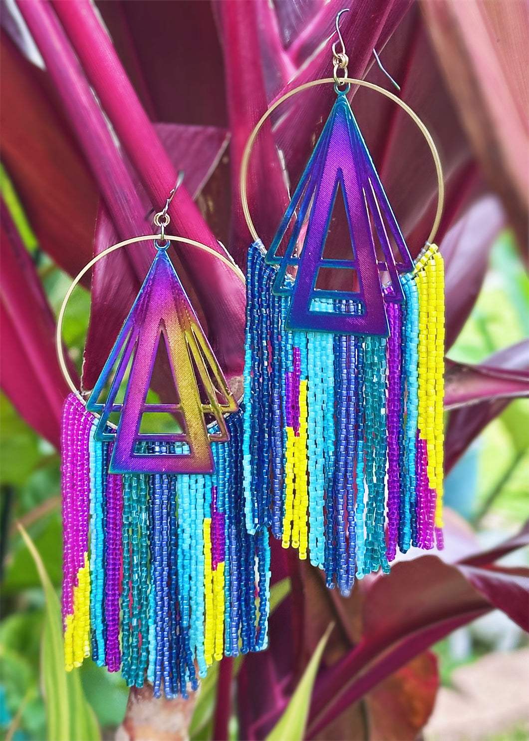 Large Geometric Triangle Rainbow Electroplated Pendant accenting Hoop with Hand woven fringe using Miyuki Delica Beads.