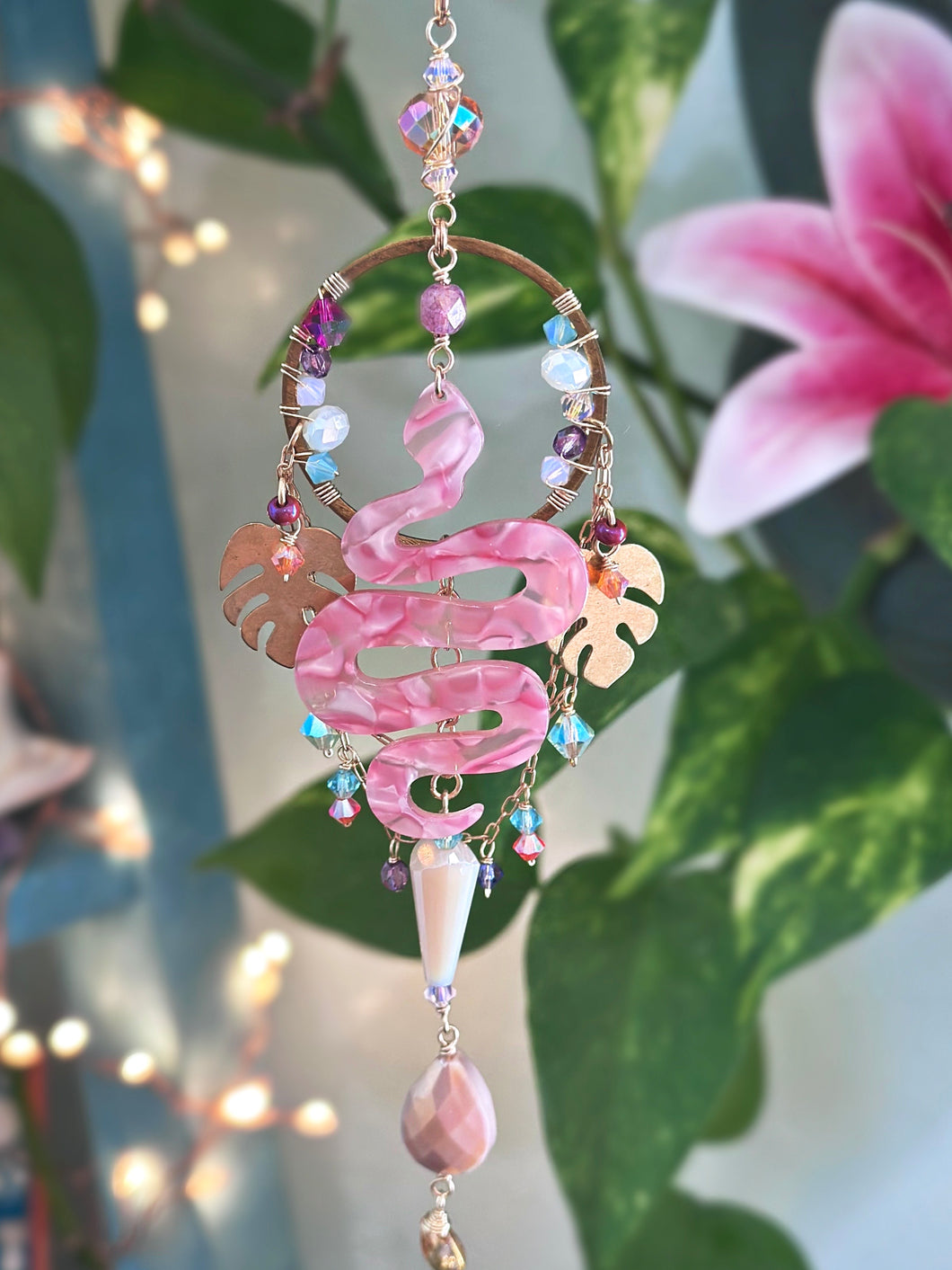 This Design includes a Beautiful Tortoise Shell Acrylic Snake Pendant in a Swirl of Pinks surrounded by colorful Crystal and Suncatcher beads in various shapes/sizes/colors and Two Brass Monstera Leaf Charms.