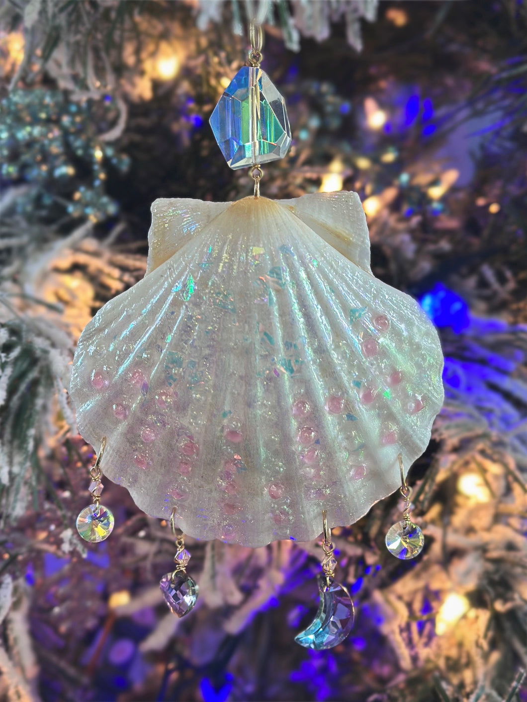 (This design includes a Shell and Crescent Moon suncatcher beads) hand wrapped Sparkly Crystal Suncatcher Beads.