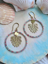 39mm Brass Hoops Hand Woven with Tropical Pinks and Pale Blue/Green Delica Beads. A beautiful Brass Monstera Leaf Pendant accents the beaded hoops.